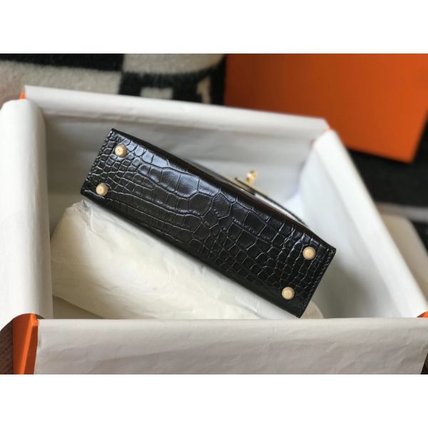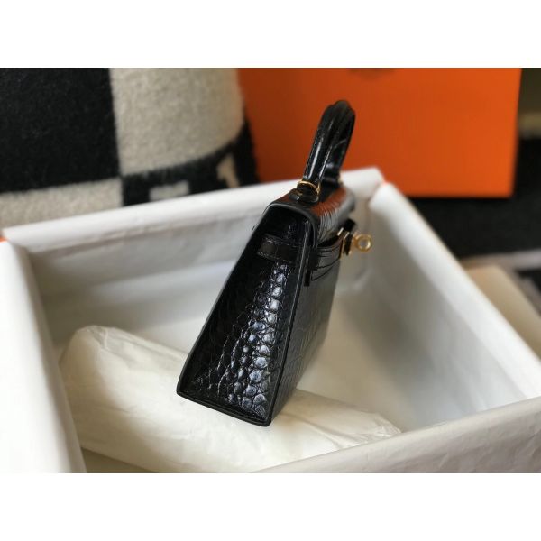 HERM Kelly Mini II Bag In Black Embossed Crocodile