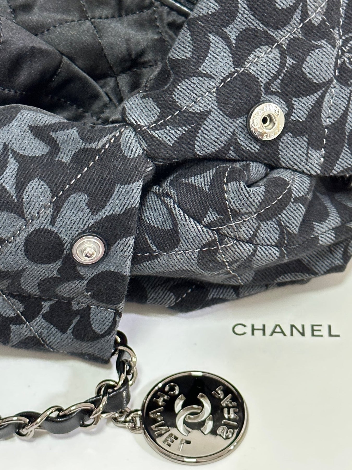 LARGE DRAWSTRING FLORAL PRINT SHOULDER BAG 39 IN BLACK MIX GREY DENIM