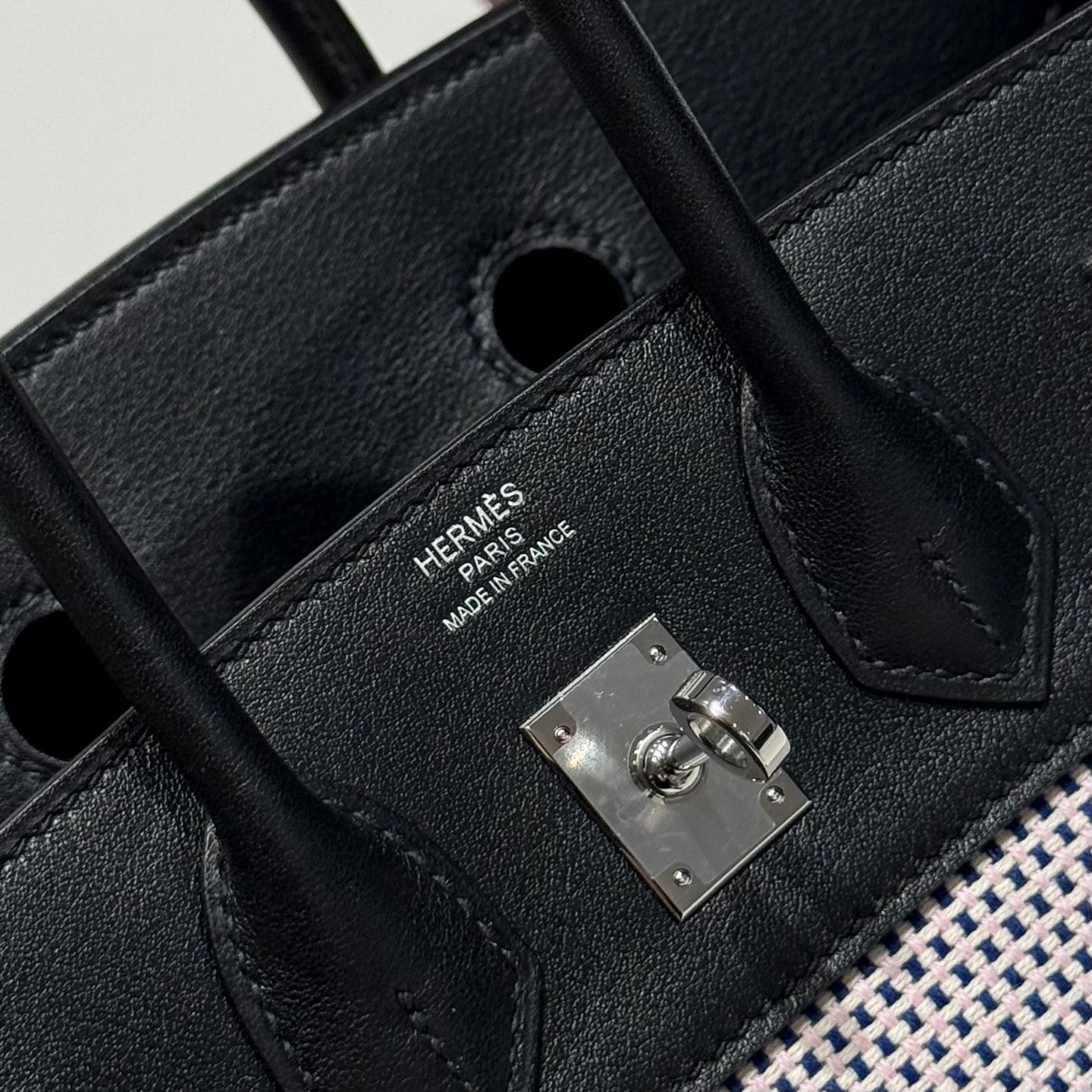QUADRILLE BIRKIN 25CM IN BLACK SWIFT WHITE BLUE PINK PLAID TOILE CANVAS