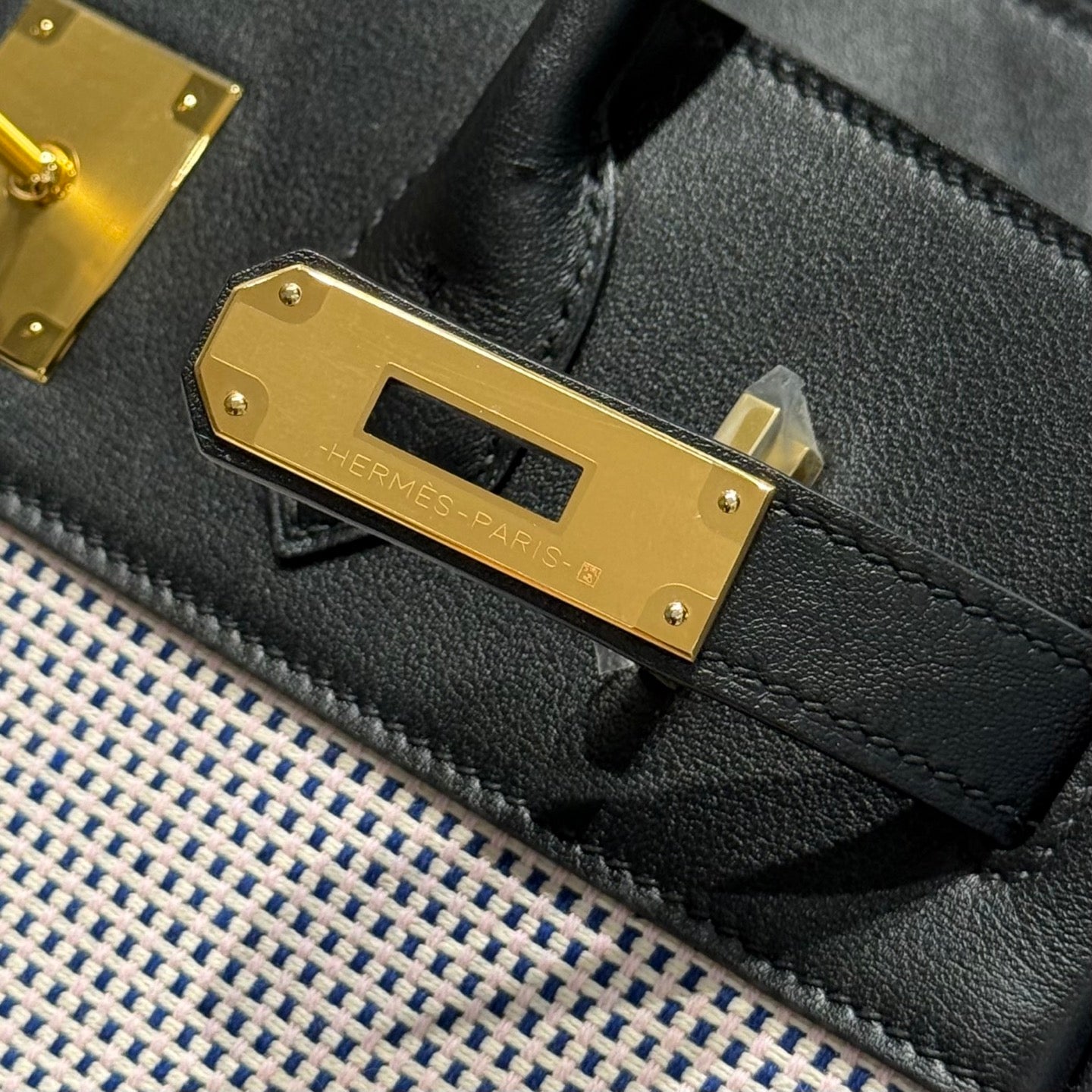 QUADRILLE BIRKIN 30CM IN BLACK SWIFT WHITE BLUE PINK PLAID TOILE CANVAS